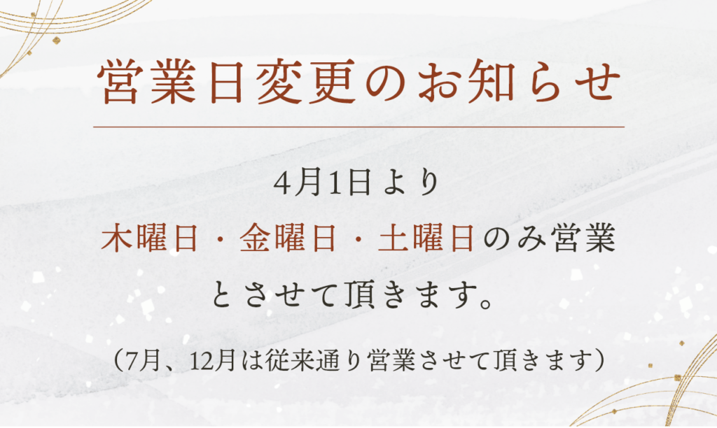 9月4日(木)・9月5日(金)・9月6日(土)は午前10時~午後4時30分まで営業させて頂きます。